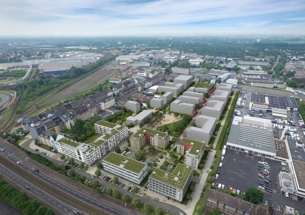 Auf Neusser Stadtgebiet, aber unmittelbar an der Stadtgrenze zu Düsseldorf, liegt das rund 55.580 Quadratmeter große ehemalige Industrieareal des Unternehmens Pierburg. Es bietet eine ideale Lage, nah an der A52 und per ÖPNV nur Minuten vom Neusser Stadtkern sowie dem Zentrum von Düsseldorf-Heerdt entfernt. Hier, an der Düsseldorfer Straße, entsteht ein neues, urbanes Stadtquartier, mit einer Mischung aus rund 30 Prozent Gewerbe – darunter ein Hotel, eine Handelsnutzung sowie Büroflächen – und 70 Prozent Wohnungsbau. Dazu zählen sowohl öffentlich geförderte und frei finanzierte Miet- als auch Eigentumswohnungen, insgesamt rund 470 Einheiten.