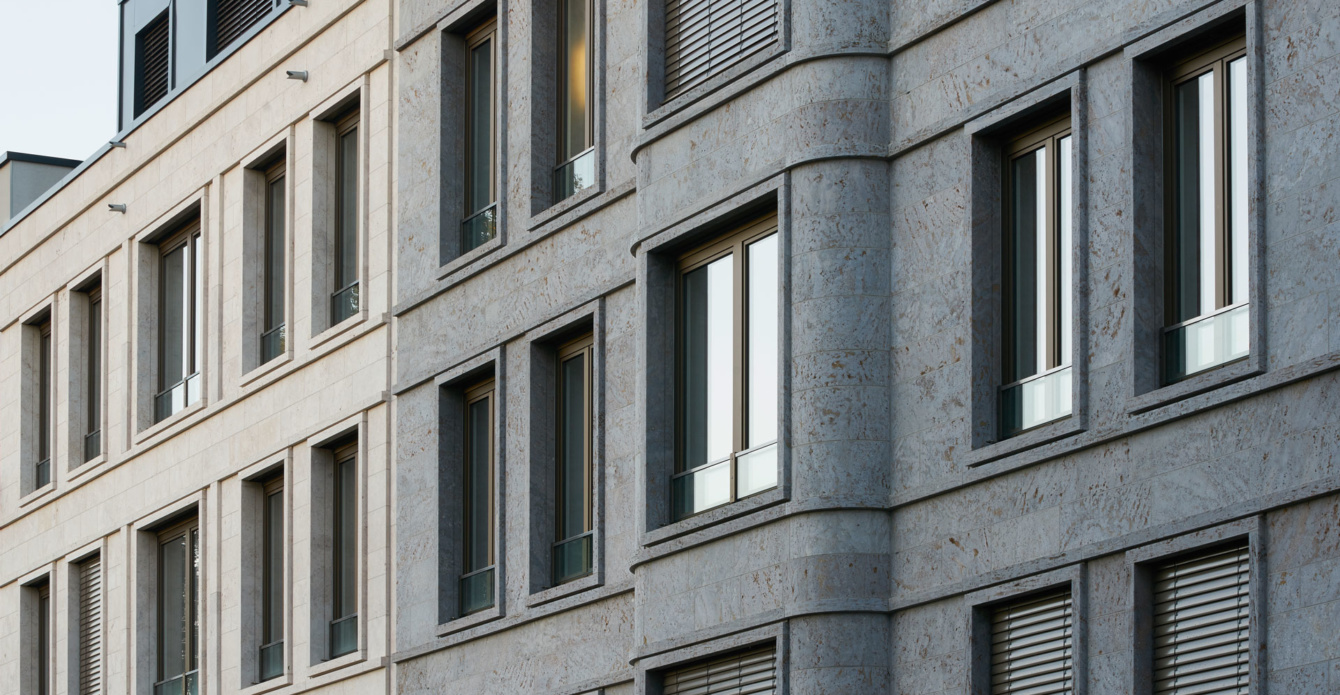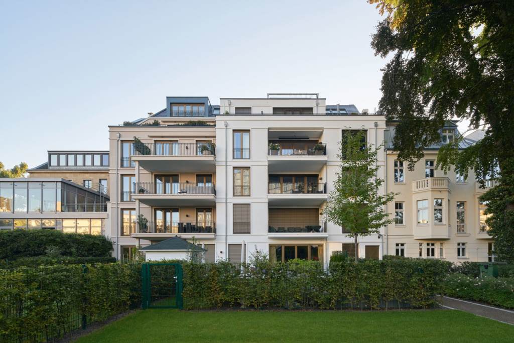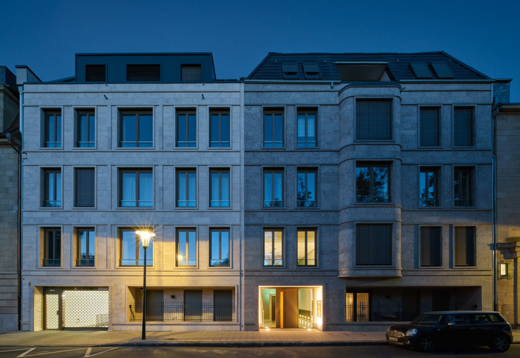 Optisch teilen zwei unterschiedliche Natursteinfassaden das Projekt in zwei Häuser: Sandfarbener Trosselfels und hellgrauer Muschelkalk stehen in Harmonie nebeneinander. Ein dreigeschossiger Erker, zweiflügelige Fenster und horizontale Lisenen sorgen für Gliederung. Mit dieser Fassade fügt sich das Ensemble sensibel in das historische Umfeld ein. Auch im Inneren herrscht exklusive Hochwertigkeit, etwa mit Juraböden für die Treppenhäuser. Jede Einheit verfügt über eine Terrasse, Balkon oder Garten und zwei Tiefgaragenstellplätze.