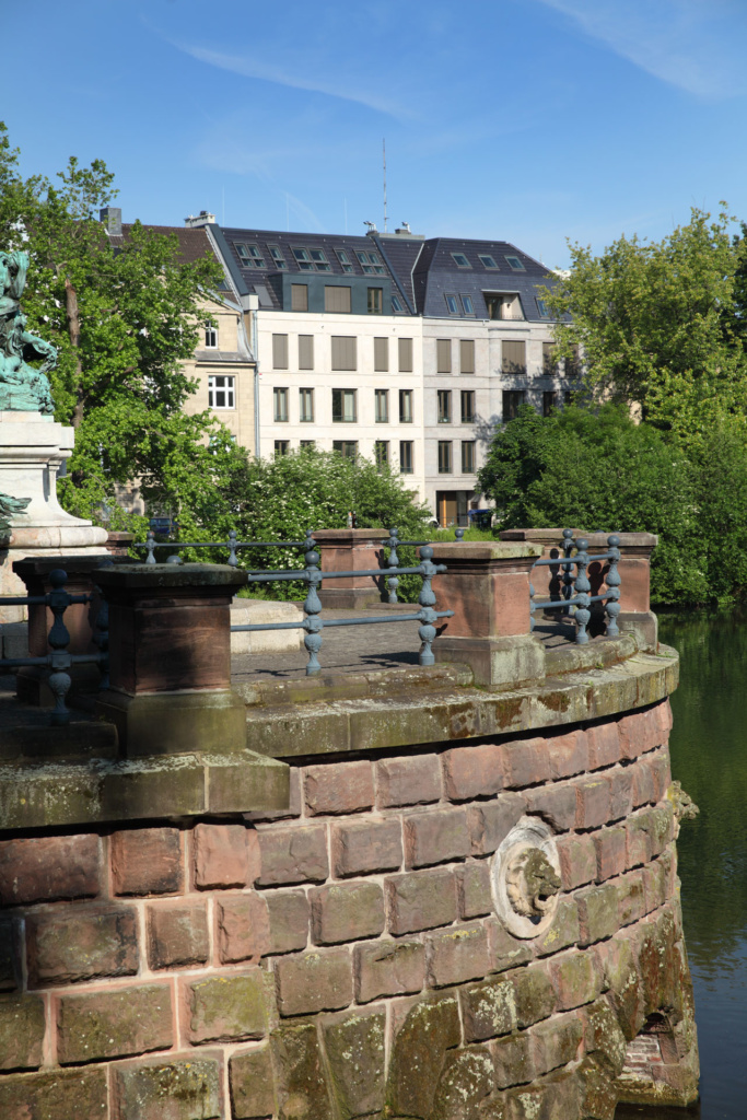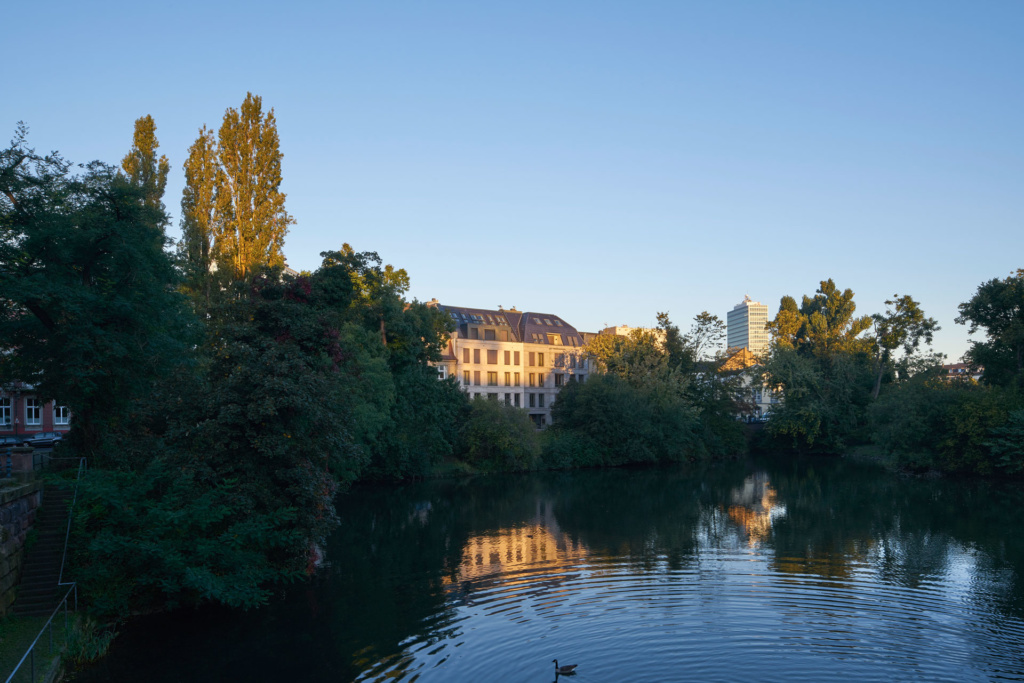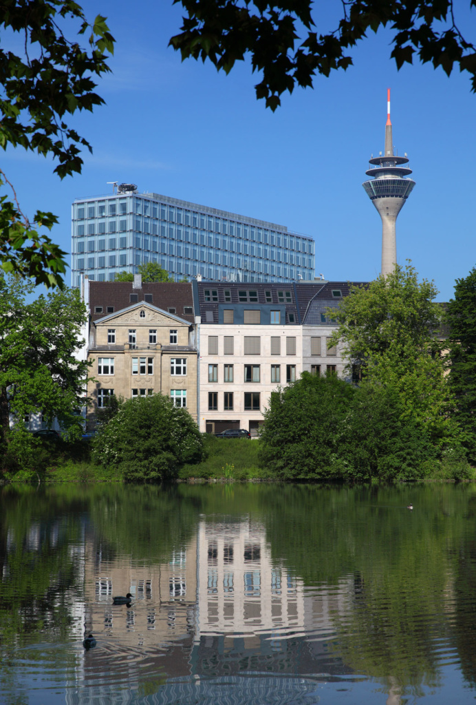 Die Wasserstraße, direkt am Ufer des historischen Kaiserteiches, der zusammen mit dem Schwanenspiegel eine Doppelteichanlage bildet, ist ein Herzstück von Düsseldorf und eine der mondänsten Wohnlagen – nah an der Rheinuferpromenade, nah an der Kö. Hier haben wir ein exklusives Wohnprojekt der Sonderklasse realisiert. Entworfen vom renommierten Büro MSM Meyer Schmitz-Morkramer, beherbergt das Objekt gehobene Stadtwohnungen mit Größen zwischen 150 und 445 Quadratmetern und wurde nach ressourcenschonenden, effizienten Green-Building-Prinzipien entwickelt.