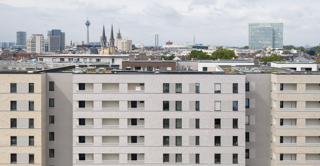 Nach einem Entwurf des Büros KSP Jürgen Engel Architekten haben wir hier entlang der Straße einen kompletten Wohnblock entwickelt. Wo vormals vereinzelte Gewerbebauten standen, bildet er eine geschlossene Blockrandbebauung aus 17 miteinander verbundenen, sechsgeschossigen Häusern mit einem zusätzlichen Penthouse-Geschoss. Mit einer qualitätsvollen Quartiersentwicklung im Blick haben wir auf eine ansprechende Freiraumgestaltung und offene Wegeverbindungen im Innenhof ebenso Wert gelegt wie auf Flächen für Nahversorgung und eine Kindertagesstätte. Insgesamt werden hier circa 470 frei finanzierte und öffentlich geförderte Wohneinheiten entstehen.
