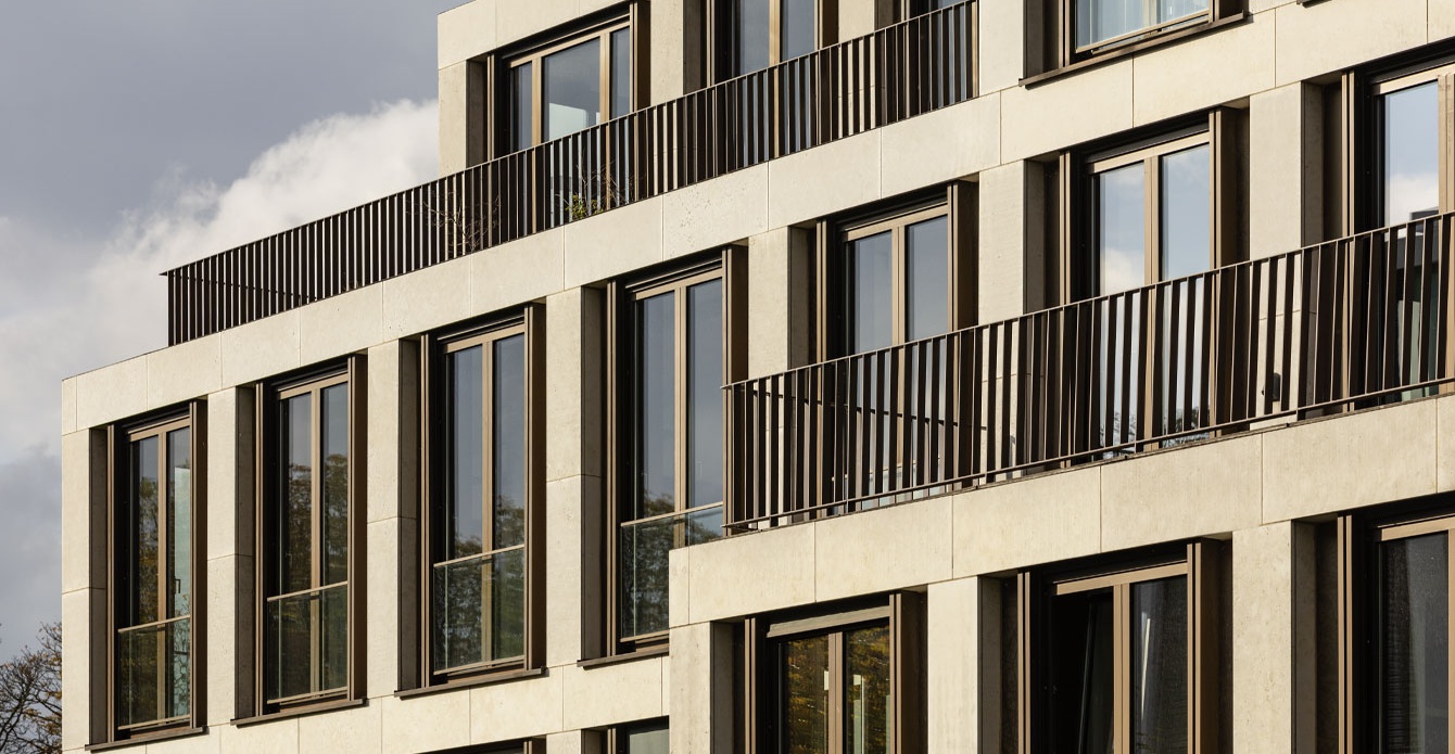 Nach einem Entwurf des international bekannten Düsseldorfer Büros HPP Architekten entstand ein kubischer, dreistöckiger Baukörper mit einem zusätzlichen Staffelgeschoss. Sein qualitätsvolles Straßenbild wird geprägt von großen Fensterflächen, die von Natursteinelementen elegant eingefasst werden. Ressourcenschonend und effizient nach Green-Building-Prinzipien konstruiert, bietet das Haus im Inneren eine flexible Aufteilung für alle zeitgemäßen Arbeitswelten und Nutzungskonzepte. Zudem ist es mit einer Tiefgarage ausgestattet und verfügt über eine attraktive Dachterrasse mit weitem Blick über den Rhein.